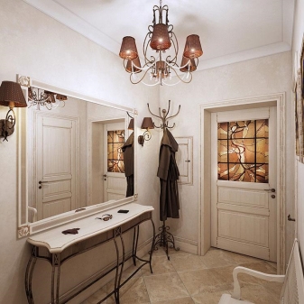 При избора на мебели се доверете на професионалния вид на дизайнер, който няма да пропусне нито един детайл. Дървени рамки, свещници, изящни дръжки на вратите, полилей с ковашки елементи – това ще направи вашия коридор буквално изложбена зала. Гостите ще бъдат очаровани от общата атмосфера, въпреки факта, че сте закупили обикновени дървени мебели и дори не скрихте драскотини, неравни повърхности.