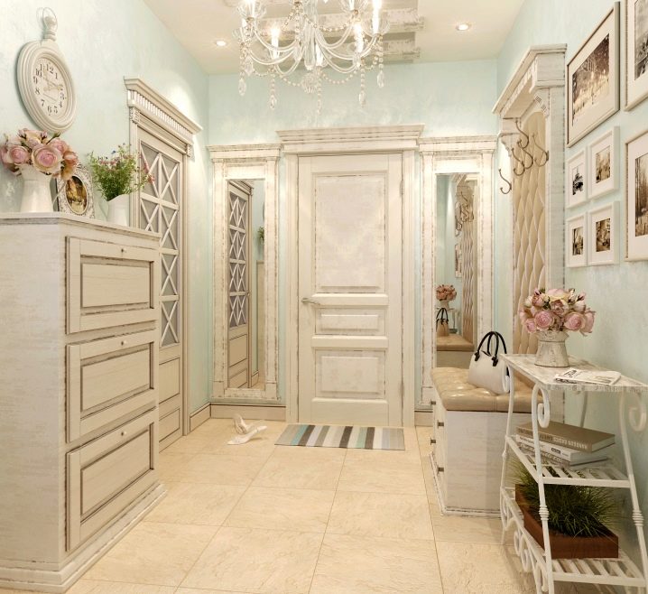 Ето широка цветова палитра за стила на Прованс. Комбинирайте общия интериор на коридора и отделните му елементи: закачалки, гардероби, пейки, подови огледала, шкафове и различни драперии.