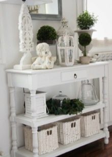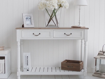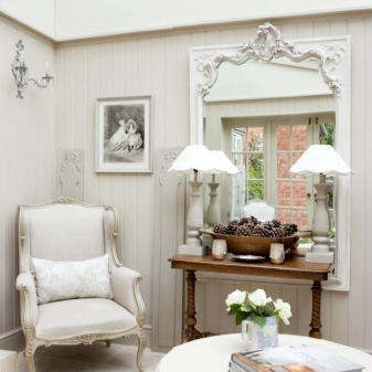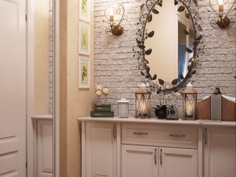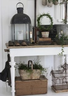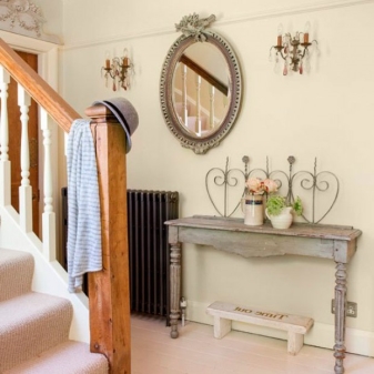 В селска къща можете да поставите дървени палетни кутии и сандъци под обемно огледало в коридора. Те ще направят интериора по -малко наперен и ще ви позволят да се насладите напълно на духа на Прованс. За апартамент е по -добре да се ограничите до настолна лампа, стилен часовник и други аксесоари, които отразяват концепцията за селска страна.