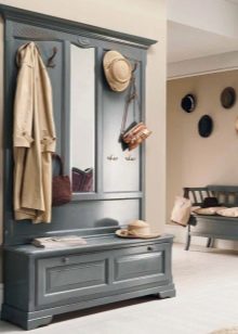 Мебелите трябва да са здрави и прости. Основната му декоративна характеристика е възрастта. Драскотини и стърготини, които се виждат през изтърканата боя, са акцентът в интериора на коридора в страната. Можете да използвате както антики, така и съвременни предмети с антични ефекти.