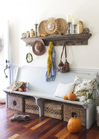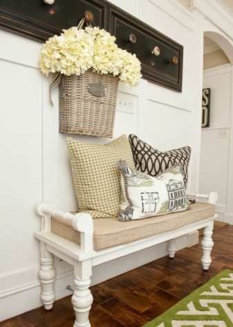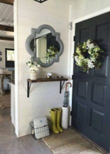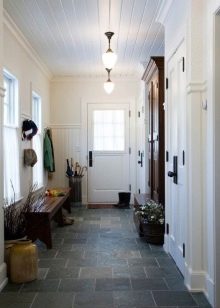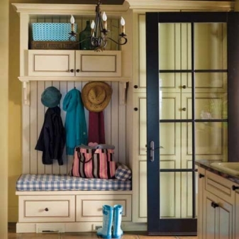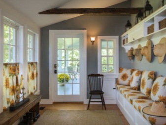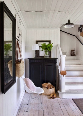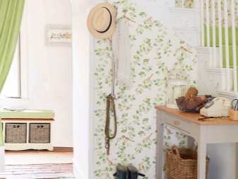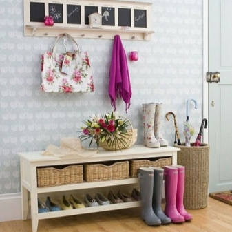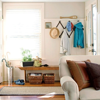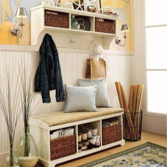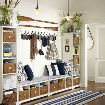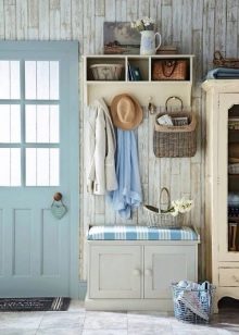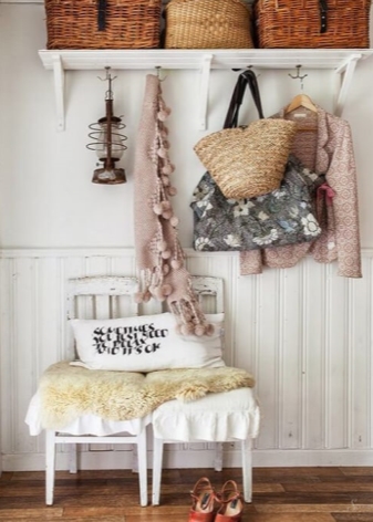 Плетени кошници за пране и съхранение на битови предмети могат да се поставят до входната врата. По -добре е да скриете всички проводници, комуникационни системи от любопитни очи. Те изглеждат подходящи в стила на таванско помещение, градски шик, фюжън, но за провинциални и селски мотиви те са „лоши маниери“.