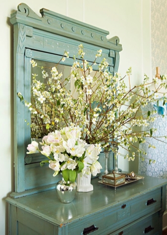 Мебелни комплекти, миниатюрни лампи и декоративни фигурки ще добавят романтика към интериора. Това е ясен отзвук на нежния изтъркан шик стил, смесен с омайващ Прованс. И в двата случая ефектът от изтъркани, състарени мебели, коване и дърворезба е подходящ..