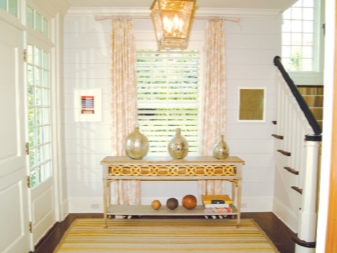 Не пестете от създаването на модерен дизайн на коридора с изобилие от текстил. Леките завеси, салфетки, покривки за маса на масичка, скрин няма да пречат на интериора. Опитайте се да използвате само лен, памук или вълна.