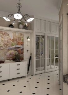 Някои предпочитат да боядисват стените в бяло, като поставят акценти със сини или тюркоазени дъски, бледо люлякови мебели. Други ще искат да поставят маса или диван с метални крака под стена с непретенциозен модел, за да придадат ефекта на стареене на самия гардероб. Огромно огледало по цялата стена няма да бъде излишно. Дизайнерите препоръчват да го декорирате с бяла дървена рамка..