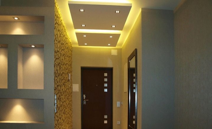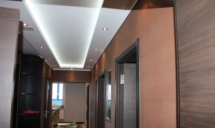 В допълнение към сложния дизайн, е възможно да се монтират светодиоди, климатик и други опции зад нивата. И с помощта на декоративни панели е възможно да се придаде на коридора визуално “пространство”.