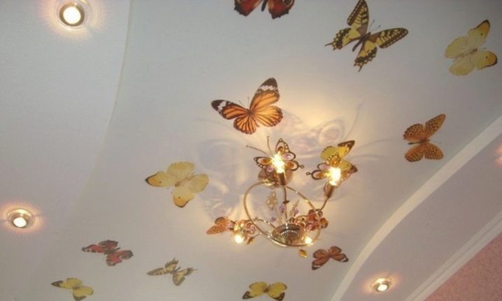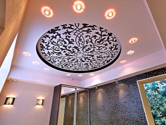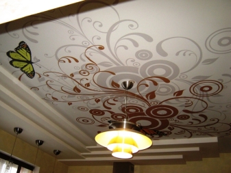 Като цяло трябва да кажа, че по отношение на цвета чисто бялото остава „класиката на жанра“. Те не се страхуват да го използват, той е съвместим с всякакви цветове в дизайна и осветяването на коридора няма да пострада по никакъв начин от избора на собствениците на бяло. По -смелите натури, разбира се, обичат екстравагантността и креативността в интериора и не искат да се ограничават до плътния цвят на повърхността на тавана. Такива натури избират опции с рисунки..