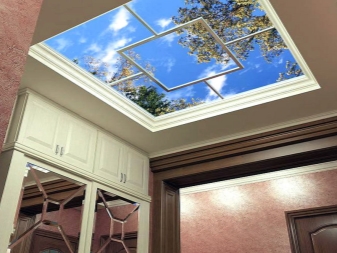Този изглед ще бъде ярък и запомнящ се елемент в дизайна на коридора. Благодарение на използването на фотопечат върху опънати тавани, дизайнерите успяват да превърнат най -смелите декоративни идеи в реалност, а собствениците на ремонта правят дизайна на коридора си уникален.
