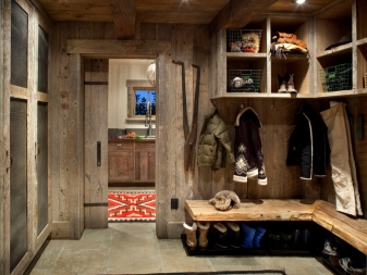 Входно антре в селски стил с голям дървен гардероб от естествен дъб. Множество куки помагат за удобно позициониране на връхни дрехи, огледало отгоре разширява пространството, а плетена кошница в ъгъла подобрява усещането за селски