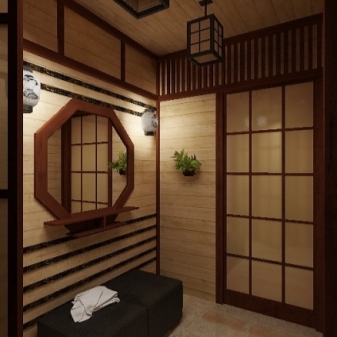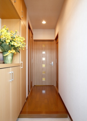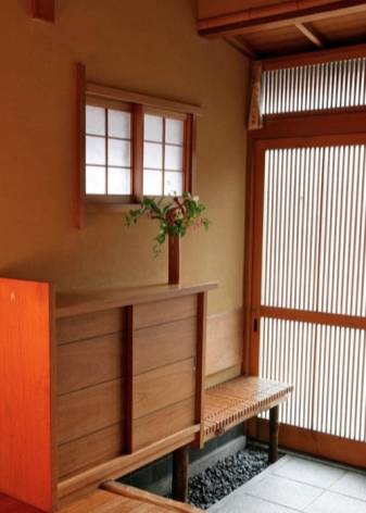 Входно антре в японски стил (genkan). Genkan съдържа шкафове за обувки, както и декоративни елементи като керамика, цветя или картини.