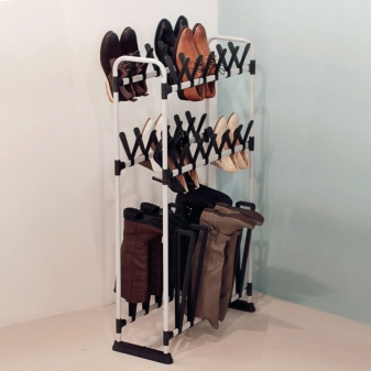 Днес разнообразието от стелажи за обувки може само да се възхищава, защото изглежда, че всички опции за съхранение на обувки вече са измислени.Основният класификатор е такъв тип пиедестали като разделянето на отворени и затворени модели. Отвореният модел има два странични панела, които държат рафтовете за обувки. Възможен е и вариант на рамка под формата на отворена кутия, когато задната част на шкафа също е покрита с панел.