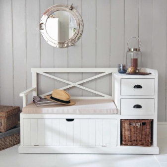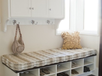 Меки възглавници върху такива повърхности или декоративни матраци от ярък текстил създават цялостното настроение на коридора. Освен това, ако такъв рафт е ъглов, тогава става много по -удобно да седнете на него..