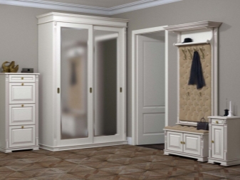 Висящо тънко огледало със средна височина в тандем с огледало с монохромни нюанси изглежда безтегловно и ефирно, като същевременно има необходимата просторност и лекота на почистване. Класически шкаф за обувки в стил знаменитост с високи извити крака, скрива обувките сигурно зад вратите на панти. Настолните лампи, разположени от двете страни на багажника за обувки, допълват сребърните шарки на багажника за обувки. Практична поставка за обувки със седалка, чекмедже и отворена поставка за обувки ви позволява да оборудвате малък коридор. Той съчетава функциите за съхранение на ключове, обувки и удобни обувки.