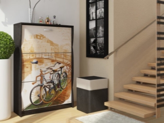 Дизайнерски висок шкаф за обувки с романтичен фотопечат може да украси всеки интериор. Тънкият механизъм помага за намаляване на пространството, използвано за шкафа. Пластмасов ярко розов шкаф е интересно и оригинално решение за малък коридор. Разреждането на богат нюанс с бял тон успокоява цялата структура.