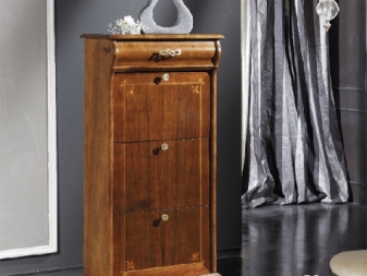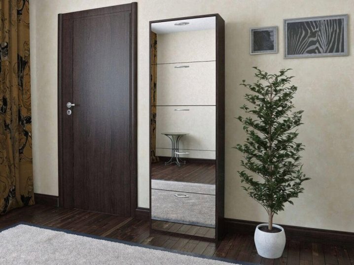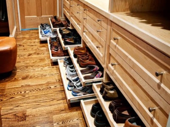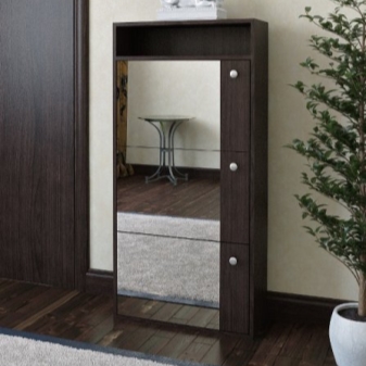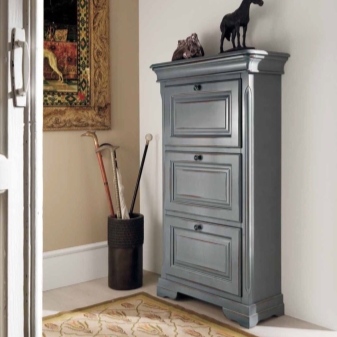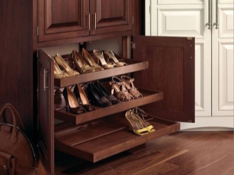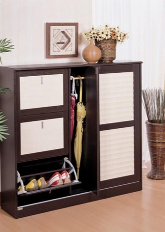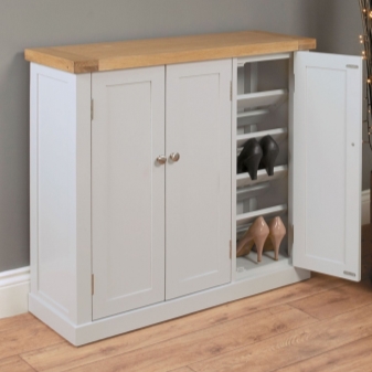 Голям шкаф по дизайн прилича повече на скрин или гардероб, но дори високи ботуши могат да бъдат поставени в такава поставка за обувки. Чекмеджетата могат да се използват не само за съхранение на обувки, те могат да побират продукти за грижа за обувки, портмонета, козметика и други малки аксесоари. Ъгловите пиедестали заемат един ъгъл и освобождават максимално място. Такива модели не са подходящи за всеки коридор. За по -голяма функционалност шкафът може да бъде допълнен с огледало или чекмеджета.