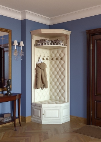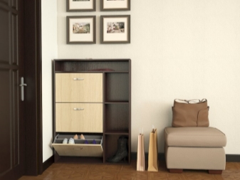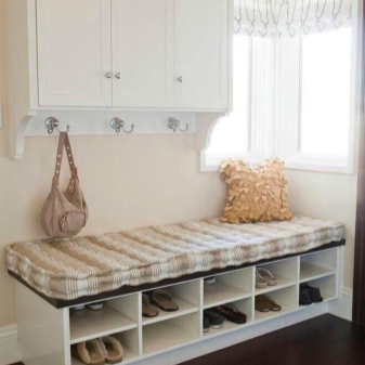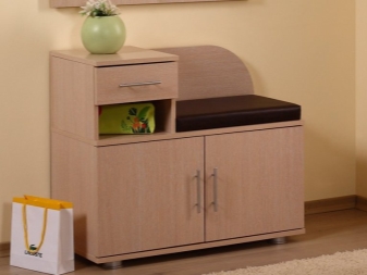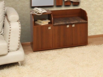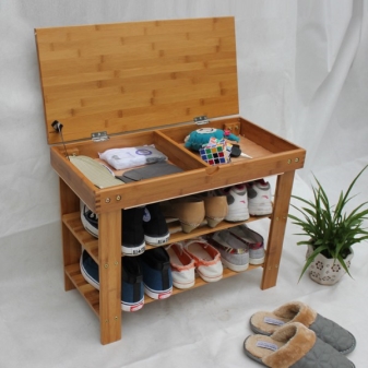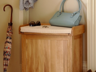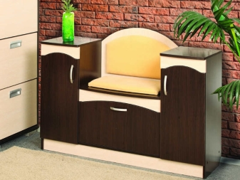 Горната част може да има не само мека седалка, но и да наподобява обикновена тахта с шарнирен капак по дизайн. Обувките могат да се съхраняват в такъв шкаф. Седалката е покрита с плътна материя, естествена или изкуствена кожа. Ако вентилационната система е обмислена в дизайна, тогава вътре в такъв пуф можете да съхранявате извънсезонни обувки за няколко месеца. Бордюрният камък може да бъде разположен по протежение на една стена или да заема само ъгъла на коридора. Линейният модел се счита за универсален и следователно е в особено търсене сред купувачите, но ако коридорът е малък и няма начин да се настани дълъг шкаф, тогава ъгловата стойка за обувки с хоризонтални рафтове ще бъде най -доброто решение. Такива модели ви позволяват рационално да използвате свободен ъгъл, като го оборудвате за съхранение на обувки.