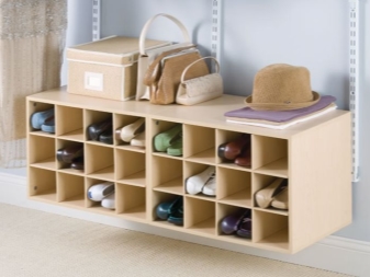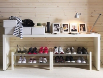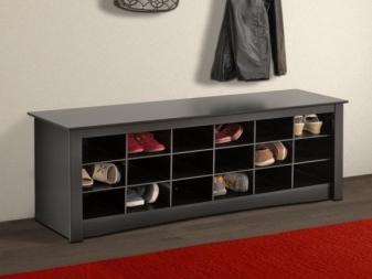 Отворен шкаф с рафтове може да заема минимум място, като същевременно компактно побира около 18 чифта обувки. Ако поставите декоративни възглавници в горната част на ниска поставка за обувки, получавате удобна мека седалка. Такива модели са особено подходящи за деца, бременни жени, възрастни хора и просто за хора, които ценят комфорта. Бордюрният камък може да има няколко отделения, което ще ви позволи да търсите необходимата двойка много по -бързо.