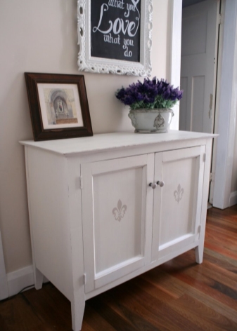 Класическият сив бюфет с резбовани врати доказва, че строгият интериор може да бъде ярък и лек.