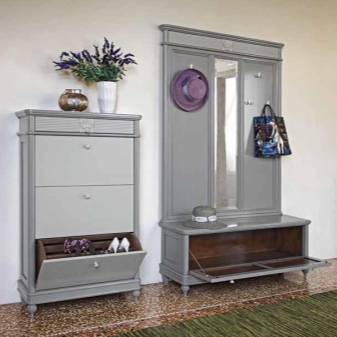 Мебелите за обувки в идеалния случай трябва да съответстват на интериора на коридора и да съответстват на избрания стил. Важно е да оцените наличните мебели, цвета на стените и пода. Най -често срещаният вариант са спокойни светли цветове с модел от естествено дърво и минимално количество декоративни елементи. Известно е, че бялото разширява пространството и светлите мебели не правят изключение. Дълъг бял бордюр изглежда доста подходящ в тесен коридор, а деликатен млечен цвят е в перфектна хармония с различни нюанси на палитрата и перфектно допълва помещение, където няма достатъчно дневна светлина. Деликатни нюанси на розово, жълто и сиво в мебелите също демонстрират гостоприемството на собствениците на апартаменти..