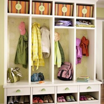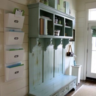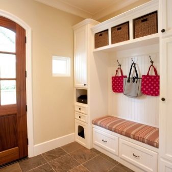Също така не забравяйте за специалното отделение за обувки. Най -добре е да изберете малка нощна шкафче с врата на панти. Между другото, в някои случаи такова нощно шкафче може да се използва и като ниска османка. Е, за малки неща можете да вземете специален рафт.