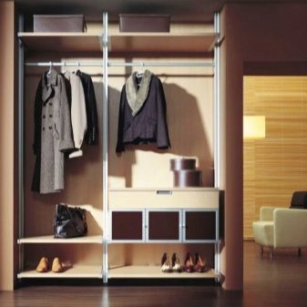 Отворените шкафове приличат на предишната версия, само без плъзгащи се врати. Вградените модели позволяват да се спести място. Вътре в такъв шкаф може да има всички необходими части за поставяне на обувки и дрехи: въртяща се закачалка, скрин, кутия за съхранение на обувки. Има и вградени мебели със седалки, в които базовите шкафове могат да функционират като пейка, особено ако са допълнени от мека повърхност..
