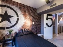 Белите и червените нюанси са подходящи за тухлена стена, които се отнасят до индустриалния стил в интериора. Опциите с графити ще изглеждат интересни: както отпечатани, така и ръчно изработени (върху тапети).