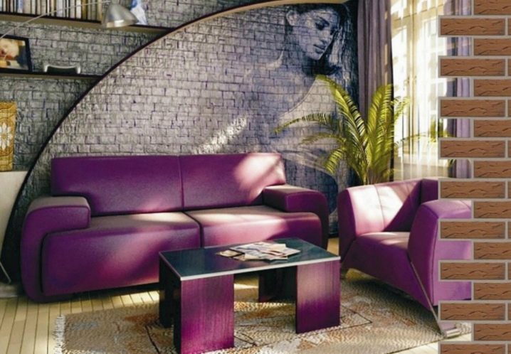Дизайнът на хола ефективно комбинира лилав текстил за тапицерия и сиви тухли. Необичаен детайл е силуетът на жена, нанесен върху основната рисунка. Тя придава на „каменната“ стена по -малко строг и консервативен вид. Интересна комбинация от зидария с дизайна на тавана.