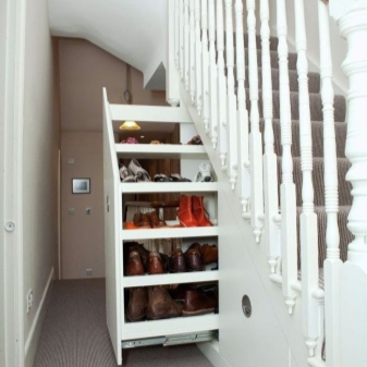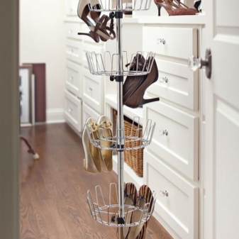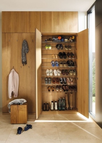 Високите стелажи за обувки са истински шкафове за обувки, които могат да държат огромен брой двойки. Те изглеждат особено органични в тандем с гардероб, превръщайки се в единна структура. Горните рафтове в килера са запазени за сезонни обувки, рафтовете на нивото на очите за ежедневни обувки. Интересно разнообразие тук е моливник, който е тесен шкаф с прибиращ се рафт. Ширината им е само 30-40 см, което е огромен плюс за съществуващата малка площ около шкафа.