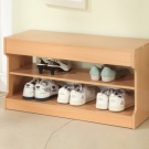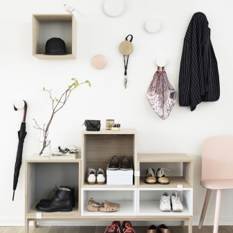 Отворен багажник за обувки с широка седалка изглежда хармонично и леко в светъл коридор. Два рафта, разделени с прегради, ви позволяват да сортирате обувките си, без да бъркате.