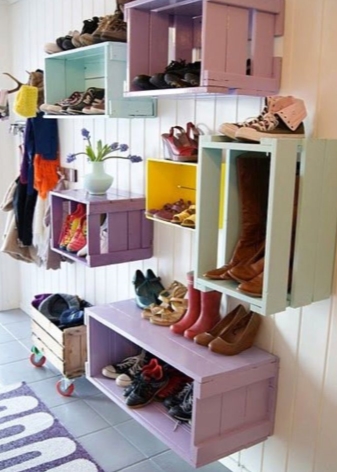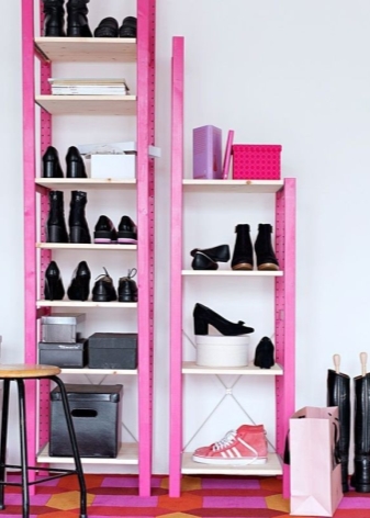 Днес стелажите за обувки нямат цветови ограничения. Напротив, дизайнерите препоръчват да не се страхувате от ярки цветове, които могат да съживят всеки коридор. Разбира се, тук не говорим за класически интериор, в който всеки детайл трябва да бъде стилизиран. Най -често в ярки цветове можете да видите рафтове от ламинирано ПДЧ и метални модели. Розово, люляково, лилаво, бяло, бордо и черно са само някои от популярните и използвани нюанси днес..