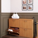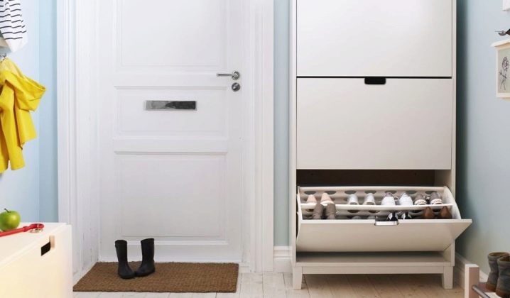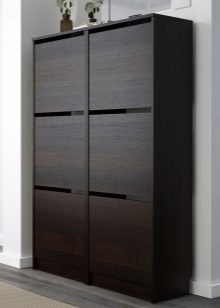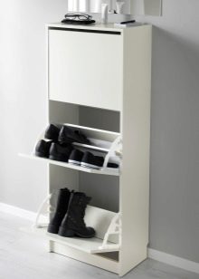 - И така, марка от Холандия Икеа отдавна се е утвърдил в Русия, където е разположил своите магазини във всеки голям град. Както знаете, интериорът на компанията е известен с минимализма и практичността на всеки детайл, а стелажите за обувки не правят изключение. Шкафове за обувки с дълбочина 30 см, с две и три отделения, имат компактен размер и добър капацитет.
