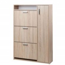 Отворен шкаф с наклонени рафтове крие обувките от любопитни очи, като същевременно има минимална дълбочина. Ламиниран ПДЧ материал с имитация на дърво позволява да се използва в класически интериор.