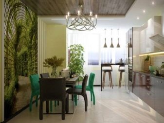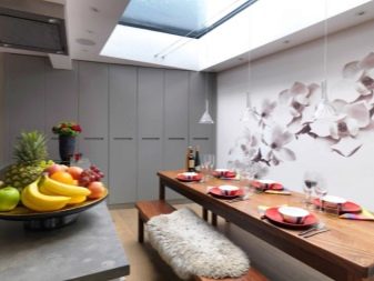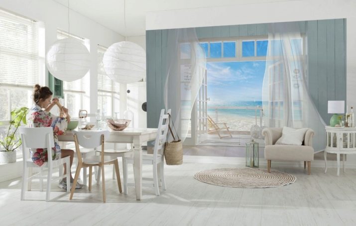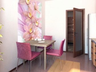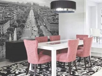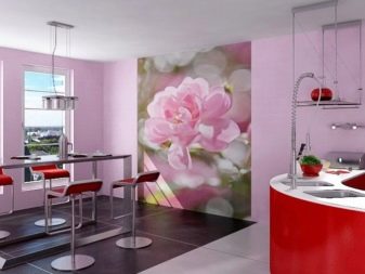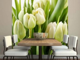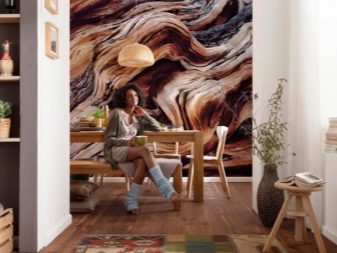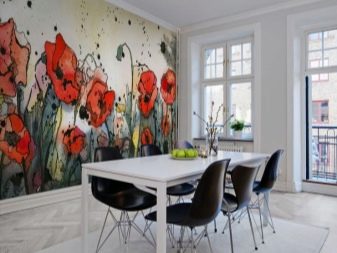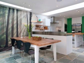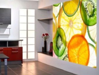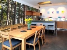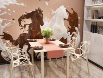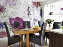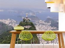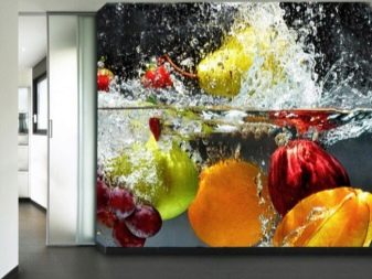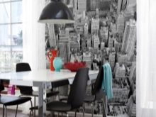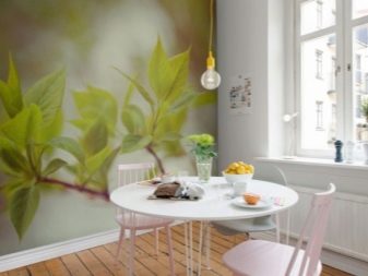 В същото време, изображението изглежда много по -правдоподобно, отколкото на тапета в класически формат, и това твърдение е особено вярно по отношение на пейзажите. В някои случаи разработчиците дори предвиждат дизайна на материала за стените, което ви позволява да залепите две или три страни на стаята наведнъж, така че целостта на изображението да не се загуби. Като минимум подобен интериор подобрява настроението и това вече е първата стъпка към появата на апетит..