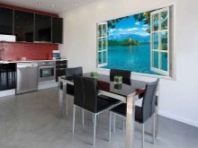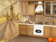 Между другото, в големите кухни най-често срещаният вариант е да се използват триизмерни тапети, при които не цялата стена е залепена с тях, а само фрагмент от нея, т.е. тапет се прилага като картина.
