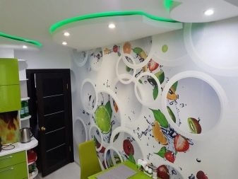Малко кухненско пространство може да бъде допълнително разширено с триизмерни тапети, ако добавите възможно най-много светлина. На малък квадрат трябва да бъде приковано максимално внимание към такъв акцент, следователно ъгълът, залепен с такъв материал, често е рамкиран с издълбана рамка и също е оборудван с допълнително осветление.