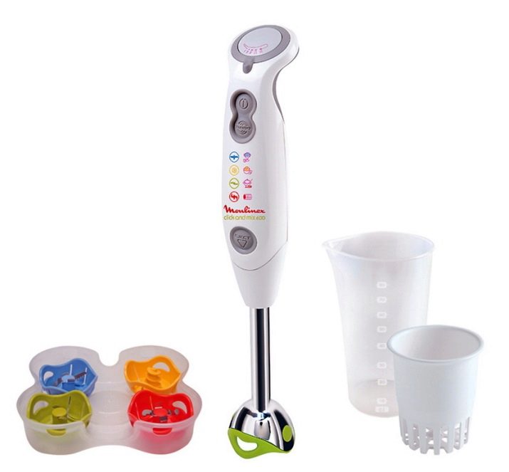 Ръчните блендери Moulinex Quick Chef са доста подходящи за тези характеристики. Моделите от тази линия имат най -високата – мощност от 800 W до 1000 W, това е достатъчно за смилане на много твърди продукти. Стъклото в този случай е метално, чийто обем е 800 мл. Комплектът включва мини чопър, бъркалка и мерителна чашка, но няма преса за лед. Голям плюс е наличието на 10 до 20 скорости, техният режим на превключване, турбо режим, удобен дисплей и защитен калник.