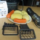 Структурата има много приятен дизайн, лесна е за използване и има бюджетни разходи. Тук плюсовете свършват. Освен ако допълнителното приспособление за нарязване на зеленчуци на кубчета не е угодно. Моделът работи с известно разтягане, тъй като ножовете са изработени от метал, който бързо изтънява и остриетата стават неизползваеми.