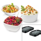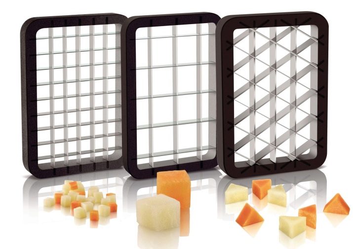 Уредът с допълнителни остриета върши отлична работа при нарязване на плодове, но е подходящ и за зеленчуци. Има няколко вида материали, които могат да се използват като незадължителна приставка за нарязване на кубчета: