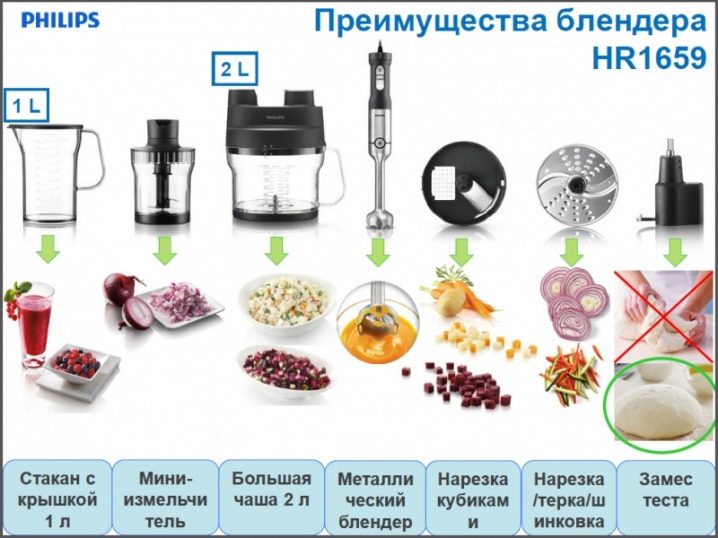 - допълнителни инструменти: остриета за смачкване на лед, режим на ускорение, мелница, дюза за нарязване на храна на кубчета.