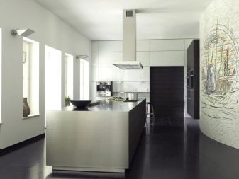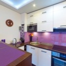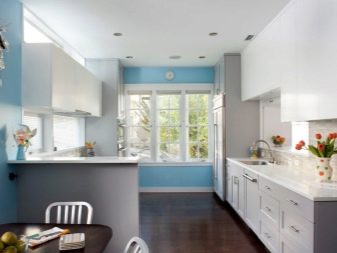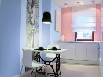 Най -добрият вариант в този случай е боядисването на стените, тъй като това покритие е светло и красиво, лесно за почистване, сравнително лесно за актуализиране и достъпно за всеки семеен бюджет. В същото време върху гладка повърхност с добре създадено осветление красиво се вижда ефектен градиентен модел, който може да подчертае индивидуалния стил на кухнята.