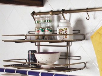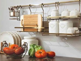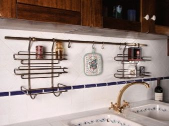 Хоризонталните покривни релси са най -популярни, те са практически класически. Те са дълги тръби, които могат да преминат по всички стени на кухнята. Понякога те се състоят от няколко нива. А хоризонталните бронзови релси са прикрепени често под стенните шкафове. С помощта на специални куки за парапети можете да прикрепите различни рафтове и държачи за кухненски прибори.