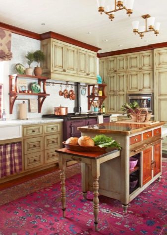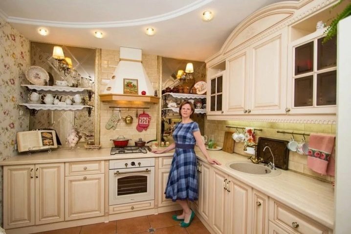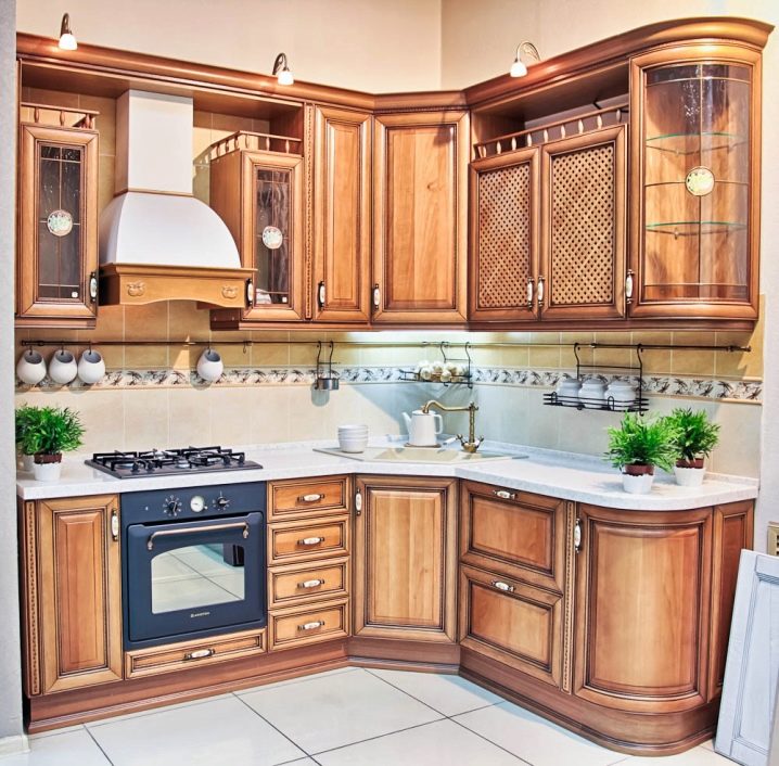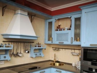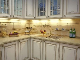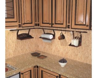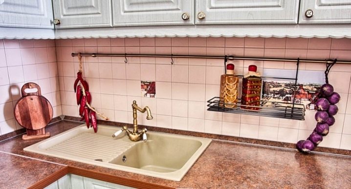 - Ако вашата кухня има ъглова мивка, тогава в тази зона можете да използвате специални парапетни секции, предвидени за съхранение на перилни препарати и сушене на съдове. Но се опитайте да изключите контакта на метал с бронзово покритие с влага, за да удължите експлоатационния живот на парапета на покрива..