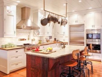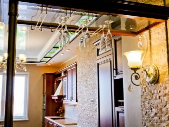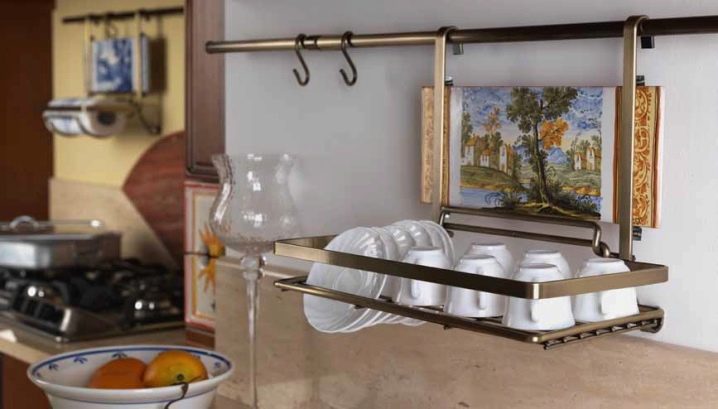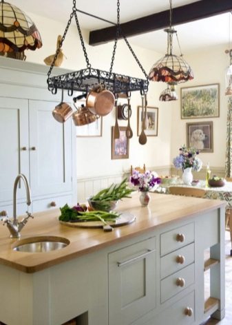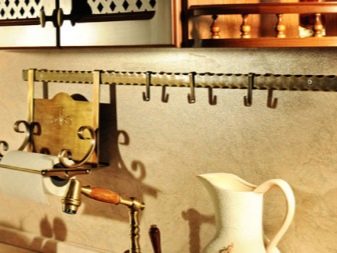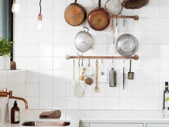 Понякога има и окачени модели покривни релси, които приличат на решетка и са прикрепени директно към тавана. Често използвани в кухни с бар плотове, е удобно да поставите чаши, чаши и чаши там. В този случай цветът на бронзовия метал ще бъде най -подходящ..