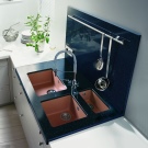 Интересно дуо от мивки от черен плот в същия цвят. Можете да допълвате ансамбъла със светъл бял или кремав тюл, можете също да окачите завеса, която да съответства на кухненския комплект, или можете да го направите без него. Такива водопроводни устройства ще изглеждат особено впечатляващи в черно -бяла кухня..