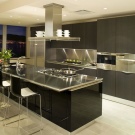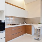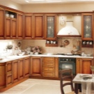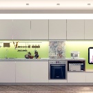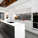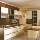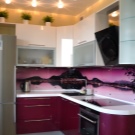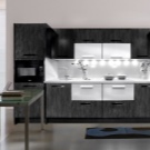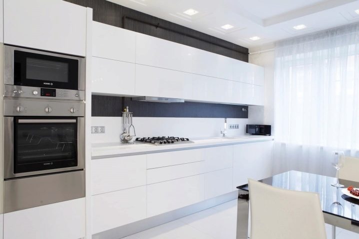 Перфектен за модерни кухни със стилни вградени уреди хай-тек стил. В този случай трябва да комбинирате и комбинирате меки нюанси от една и съща цветова схема. По -добре е да украсите престилката и плота със същите довършителни материали, желателно е цветът им също да е идентичен. За такъв интериор черно -бялата работна зона и подобна работна повърхност на масата са идеални..