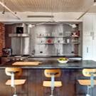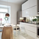 Друго интересно решение би бил дизайнът на кухнята. в техно стил. В този случай цветовете ще трябва да се комбинират, както следва. Работната зона трябва да бъде украсена с прозрачно стъкло с матово покритие или сиви керамични плочки в метален цвят. Комбинацията от метален цвят на кухненската престилка с бели стени изглежда много оригинална. За да украсите такава кухня, можете да използвате железни декоративни елементи..
