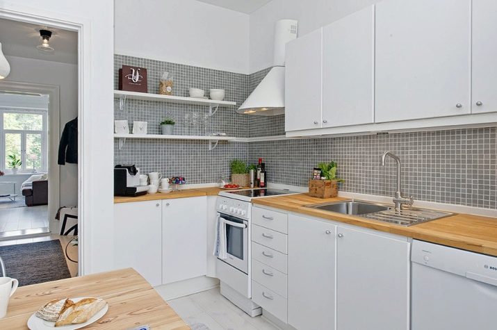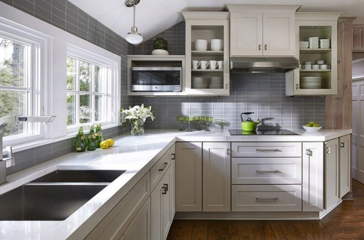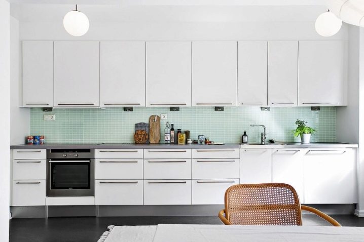 Зоната на престилката трябва да бъде озарена и защото е удобна от практическа гледна точка. Работното пространство с тъмен или наситен цвят се измива и почиства по -лесно. Той е по -малко забележим за пръски или петна, които могат да се образуват по време на готвене. Универсалността на бялото покритие се проявява и във факта, че можете безопасно да смените всички кухненски мебели с нови, без да правите ремонт, тъй като този нюанс ще подхожда на всяка слушалка..