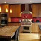 За селски стил или за английски дизайн е по -добре да използвате по -ярки комбинации. Тук можете да използвате тухлен цвят, червен или черен. Можете да украсите работната зона с материал с имитация на тухлена зидария. Тази идея е идеална както за светли, така и за тъмни кухни. С този дизайн комбинациите от червено и бяло или черно -бели цветове са добре дошли..