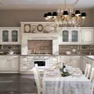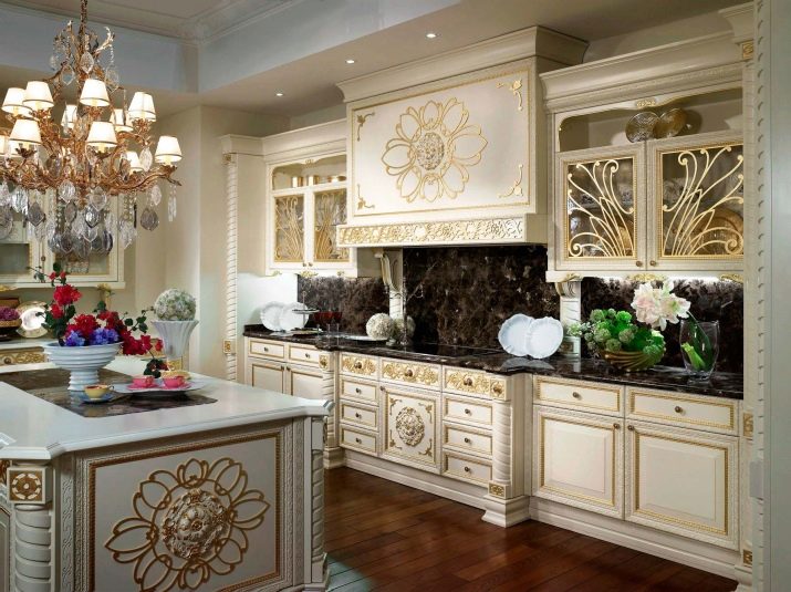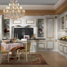 Класическа кухненска престилка барок може да бъде украсена с бели плочки с шарки. Стъклените панели ще ви бъдат полезни в такъв интериор. За бял кухненски комплект би било по -добре да направите стени със златни шарки и картини. Този модел може да бъде направен както матов, така и лъскав. Работна зона със златна мозайка изглежда страхотно, тъй като пасва идеално на светли стени и изглежда луксозно.