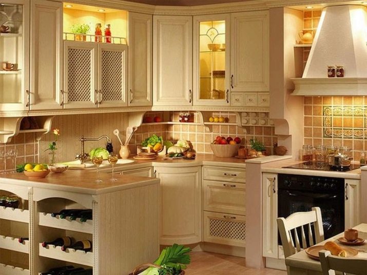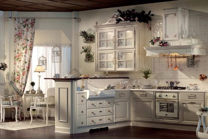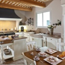 За светла кухня в стил Прованс по -добре е да използвате комбинация от бяло с бледо розово, бежово, светло синьо и други пастелни цветове. Можете да украсите работната зона с изкуствено състарени материали, така че да се вписва по -добре в такъв интериор..