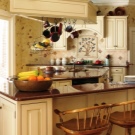 Кънтри стил може да бъде допълнен с изображения на растителни рисунки по стените. Такава декорация на функционални зони ще внесе уют във вашия дом. Меките и гладки линии, които разделят престилката и останалата част от стаята, изглеждат много приятно..